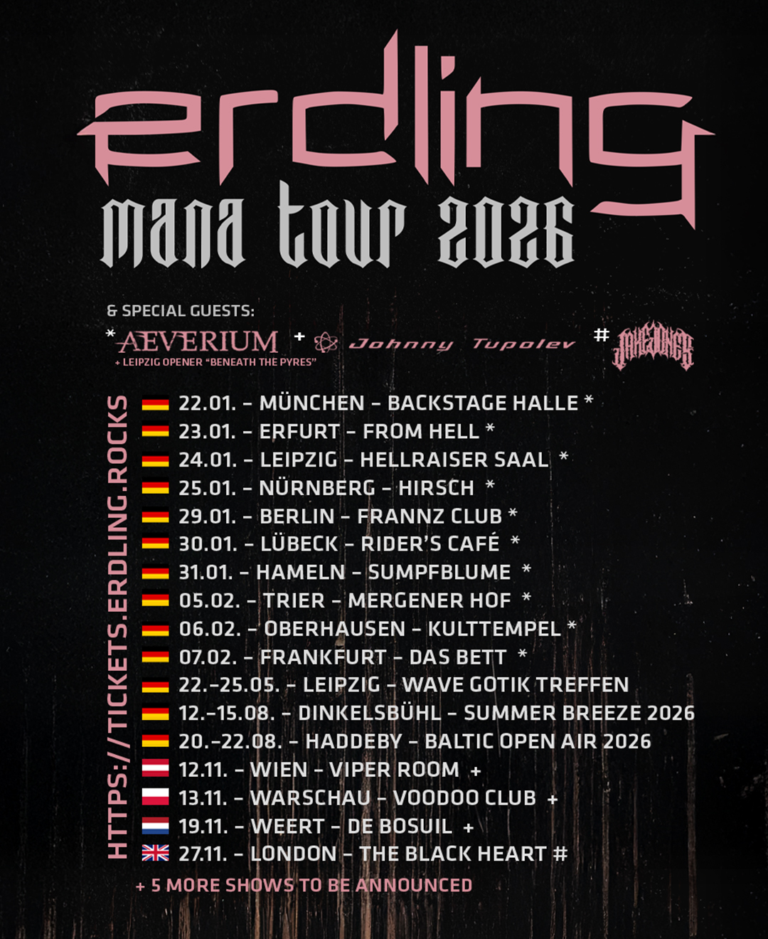 Die NDHler oder Düsterrocker von ERDLING haben letztes Jahr ihr Album „Mana“ veröffentlicht. Ein, wie ich finde, sehr sehr geiles Album und daher auch teil meiner Top 3 2025, auf jeden Fall eines meiner musikalischen Highlights des letzten Jahres. Hier gibt es deutsche Texte mit harten Riffs und pumpenden Beats oder auch gefühlvolle Metal Gothic Balladen.
